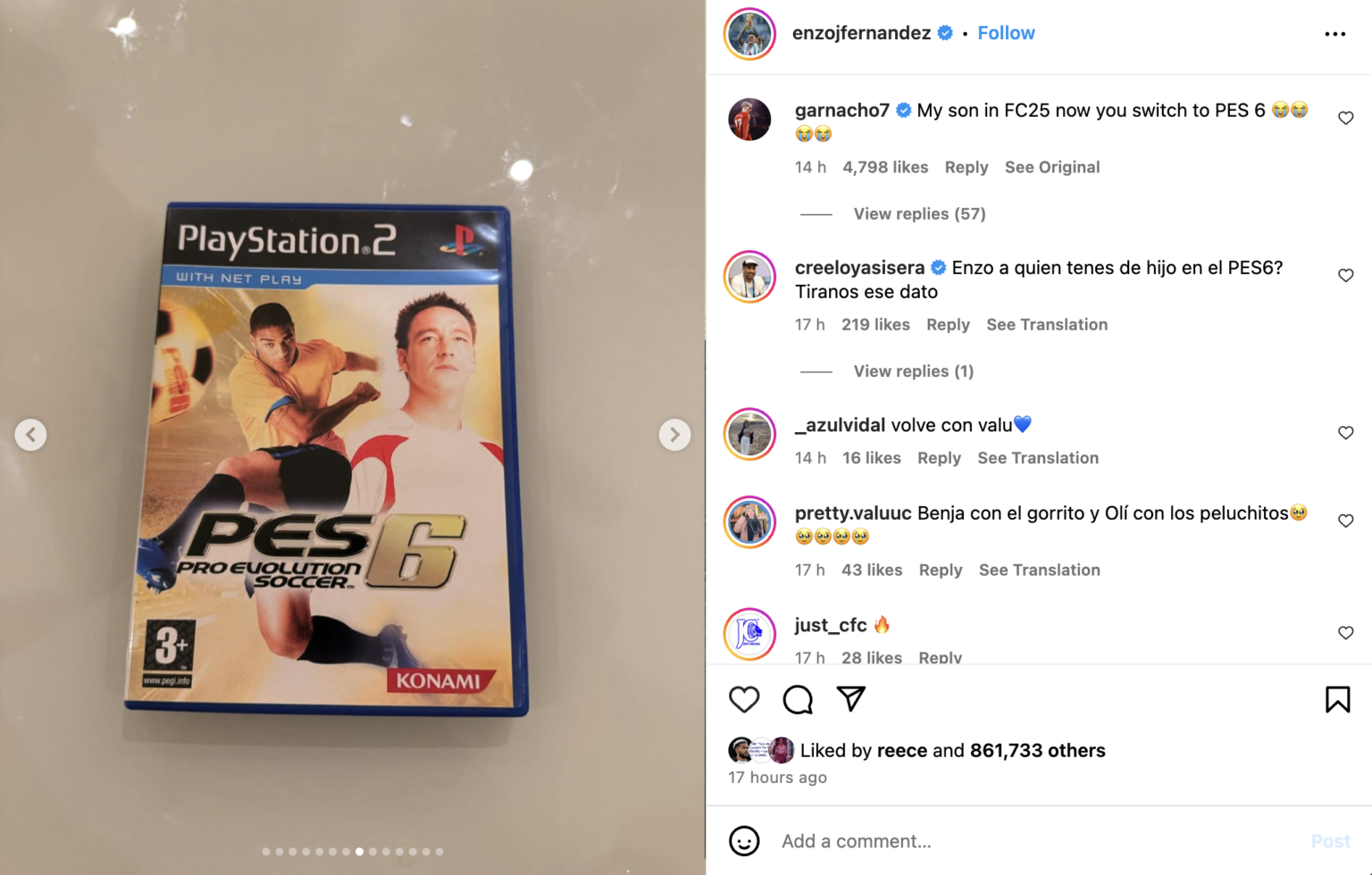 Garnacho took to Instagram to respond to his international teammate’s most recent post, saying: “My son in FC25 now you switch to PES 6,” in reference to the video games.