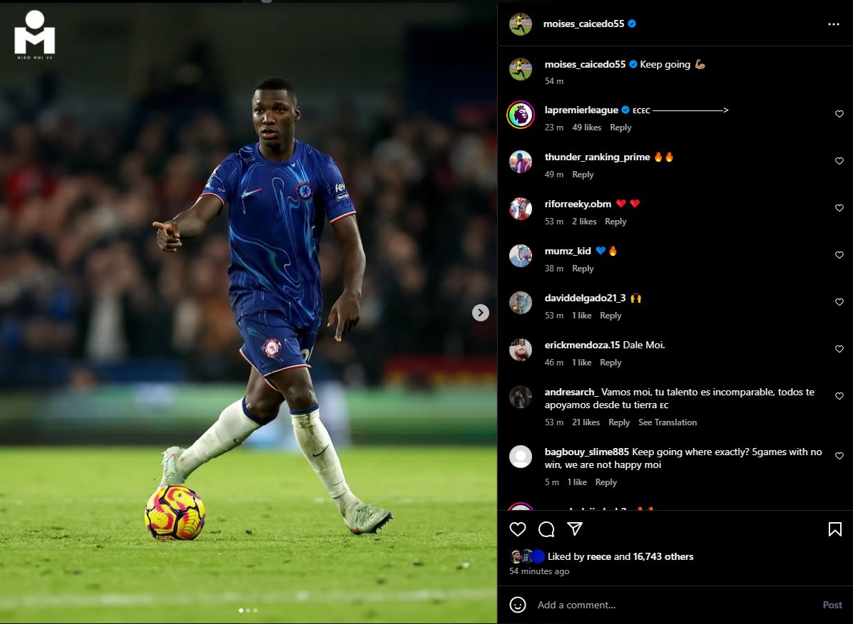 However, Caicedo is instead looking to put the result behind him and focus on the next game, his post on Instagram is accompanied by the simple, yet effective message: “Keep going.
